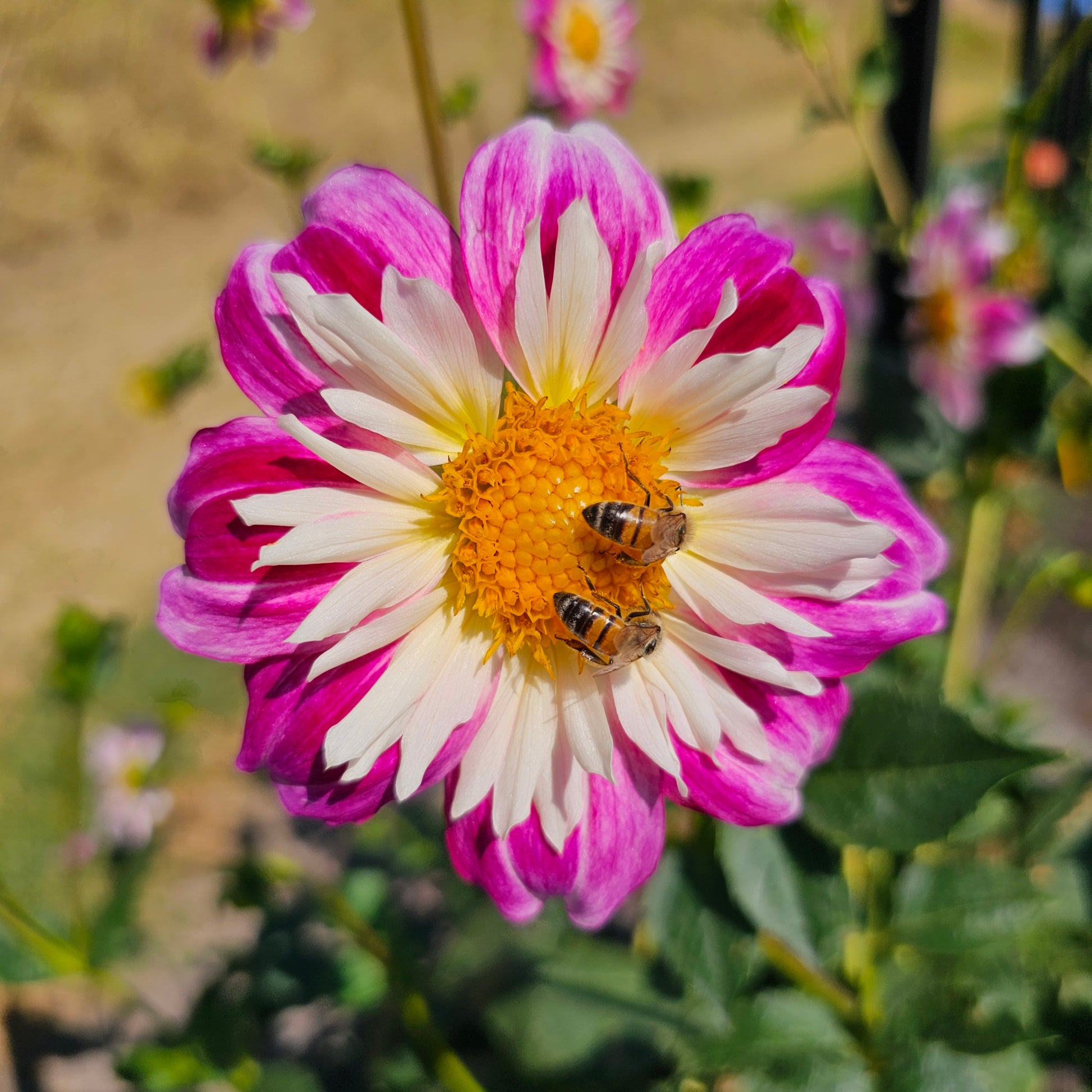 A vibrant Collarette dahlia with variegated pink and white petals, white collar and a yellow centre.