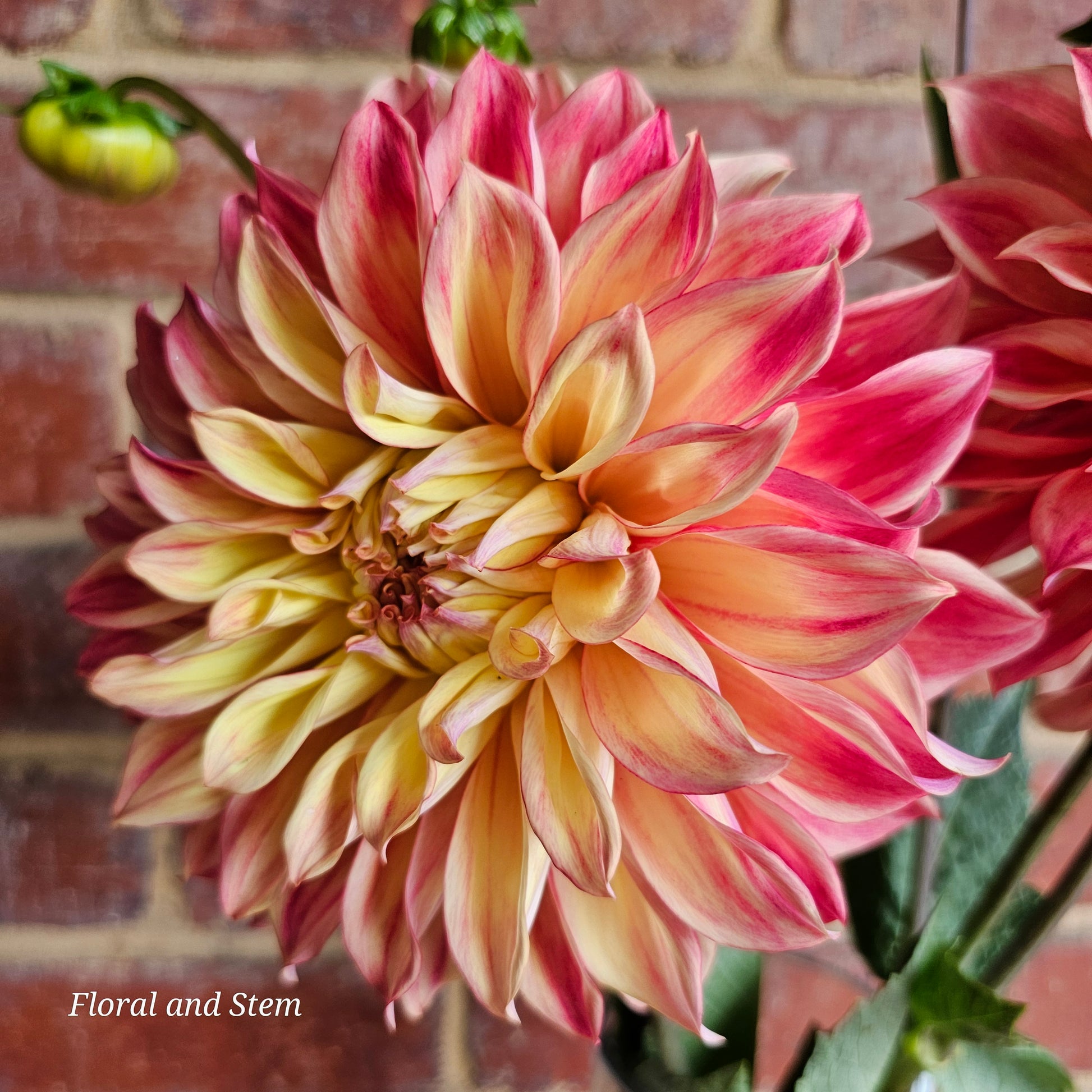Alden Rocket is a breath-taking large to dinner plate sized Dahlia. It features a varying combination of buttery yellow and red.