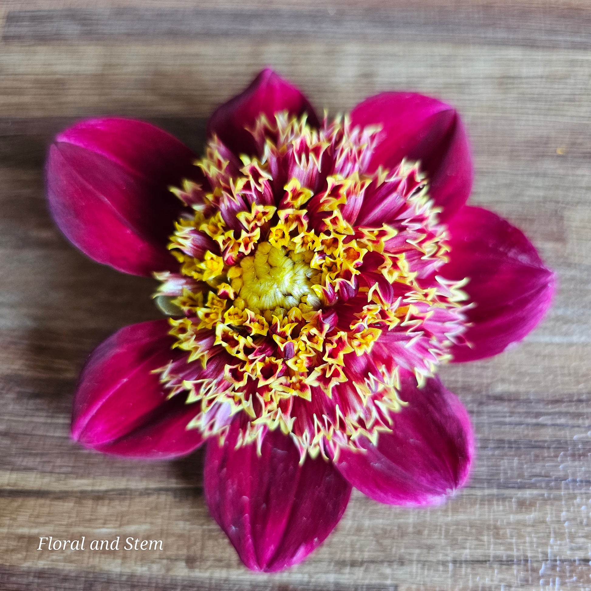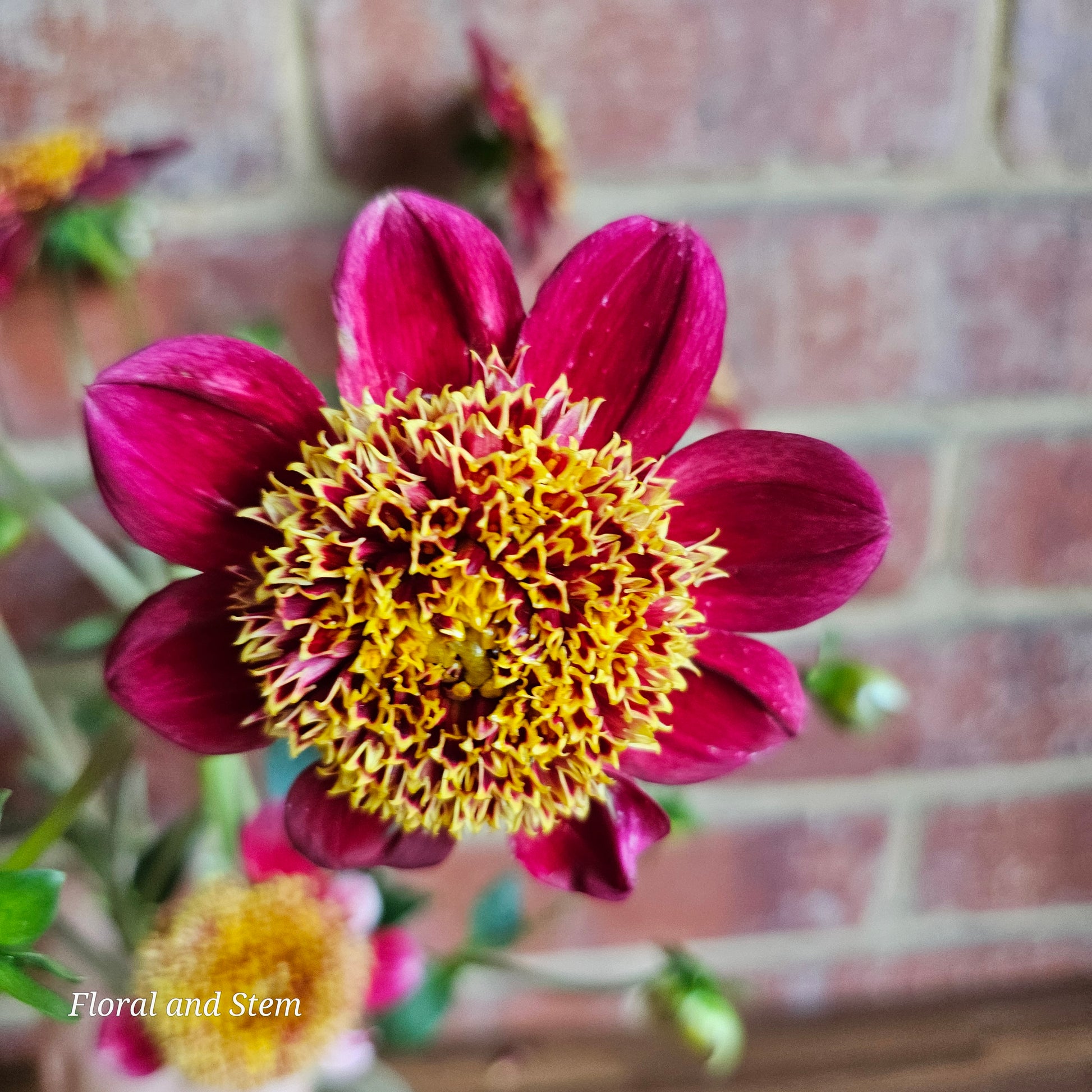 The intriguing form of an Anemone dahlia makes for vocal point in any garden. The pink-burgundy outer petals contrasted with the yellow centre is pleasing to the eye!