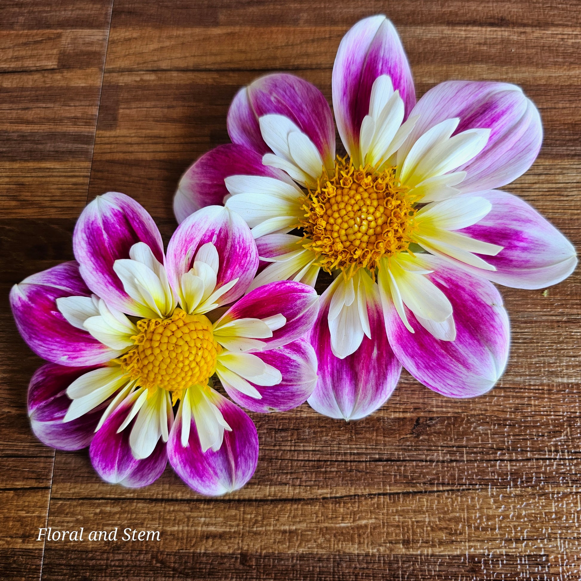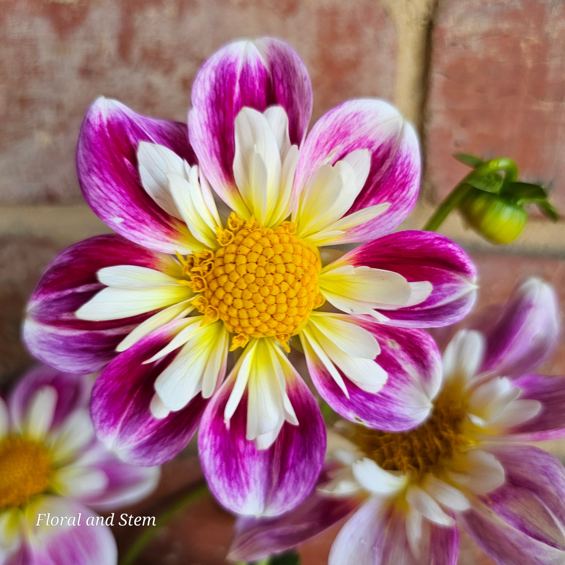 A cheerful, pink and white variegated Collarette dahlia, that has a lovely soft lemon to white collar that makes a delightful contrast to the vibrant pink.