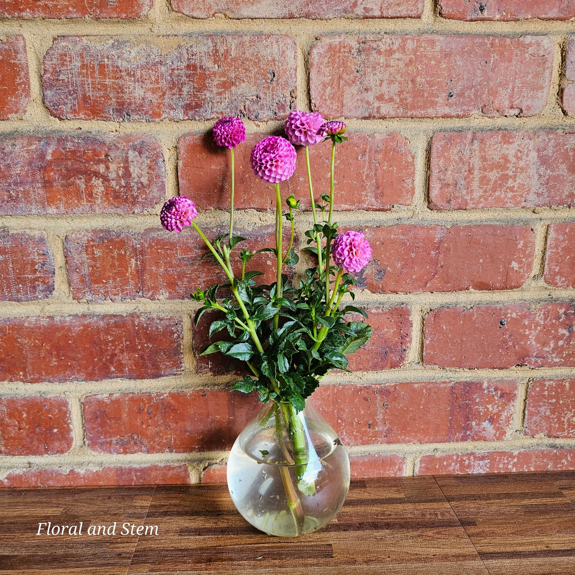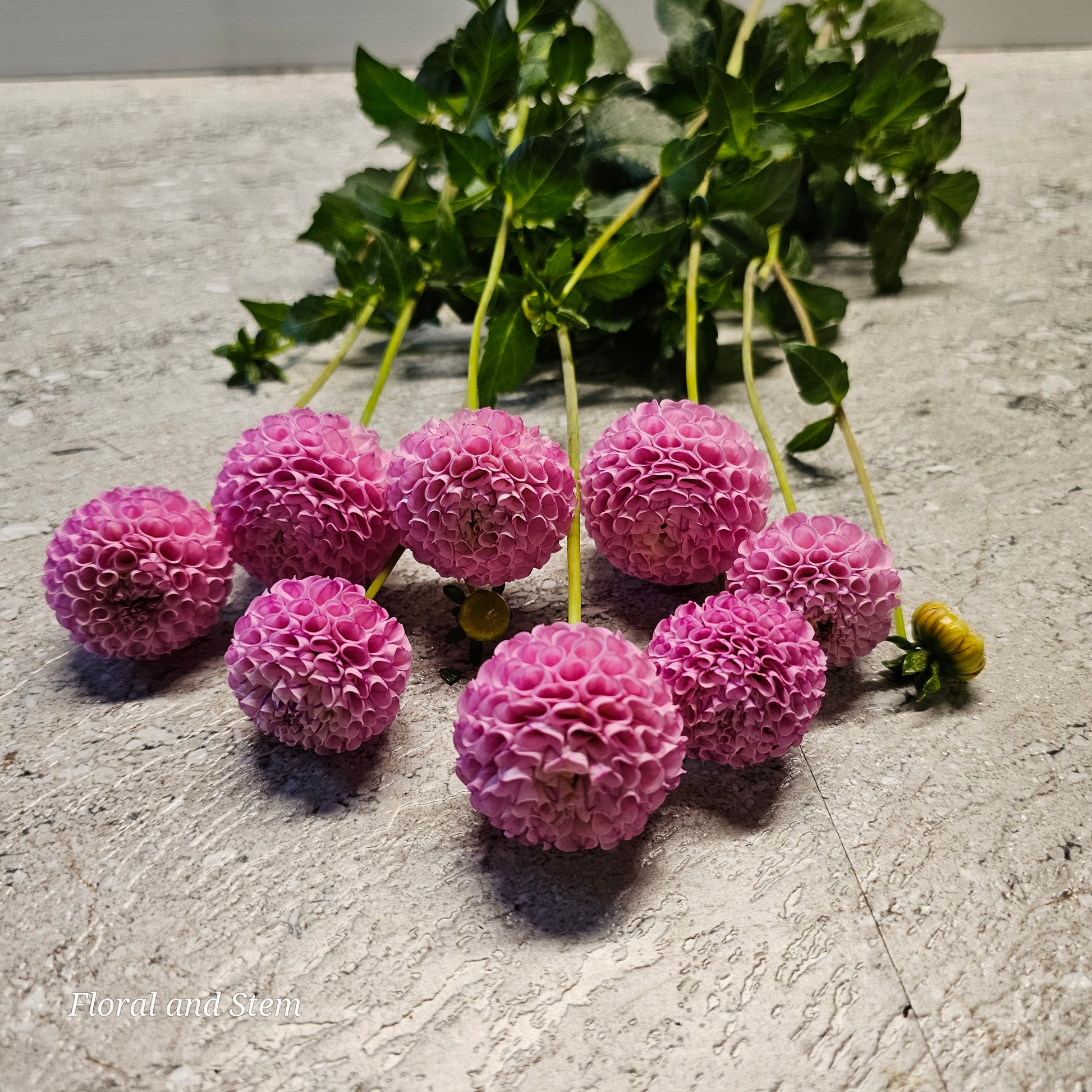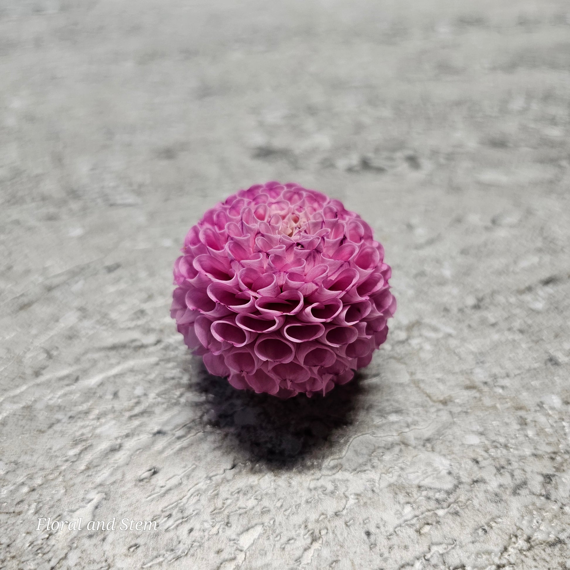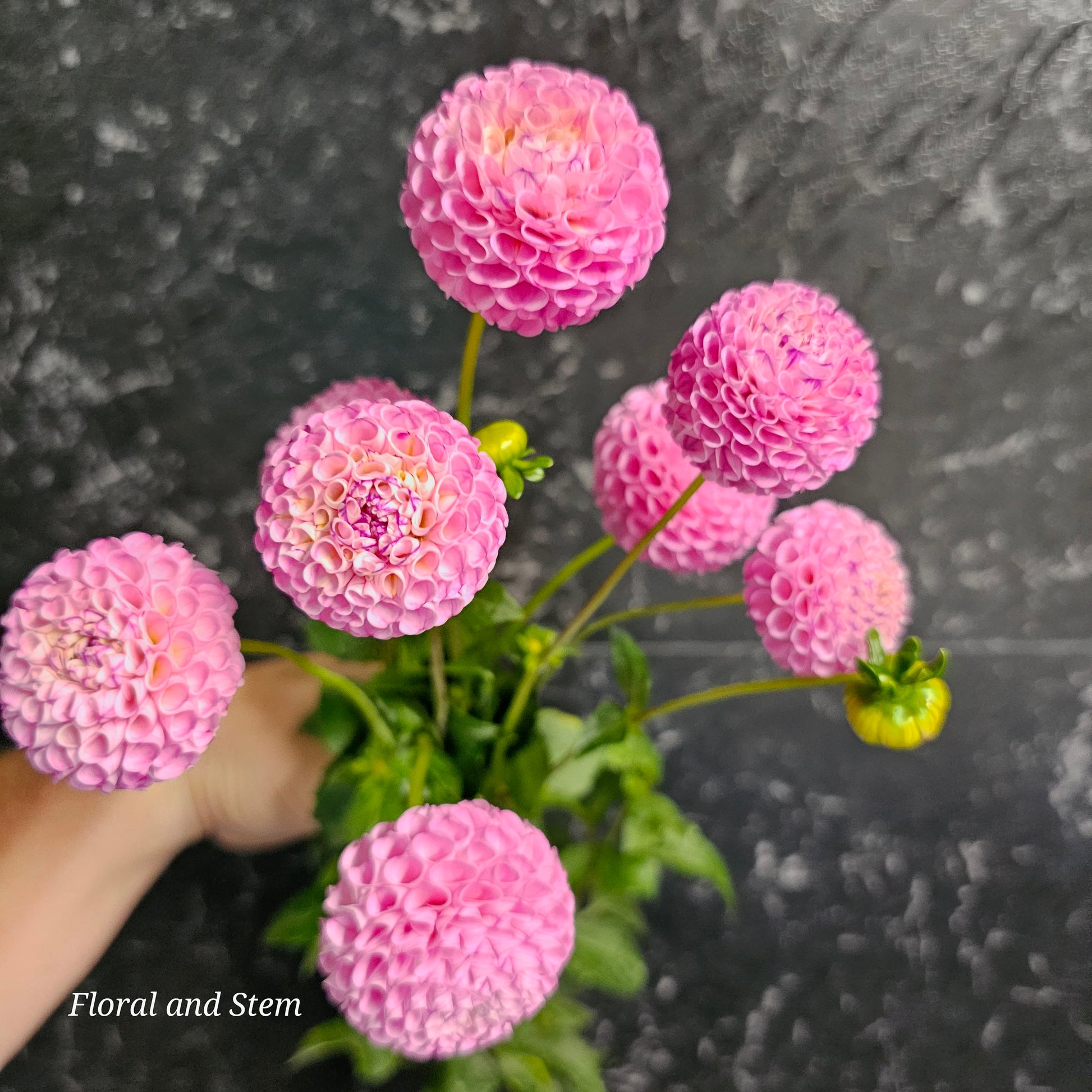 A delightful creamy pink Pompom dahlia that features subtle patches of yellow that peak through from the base of the petal.